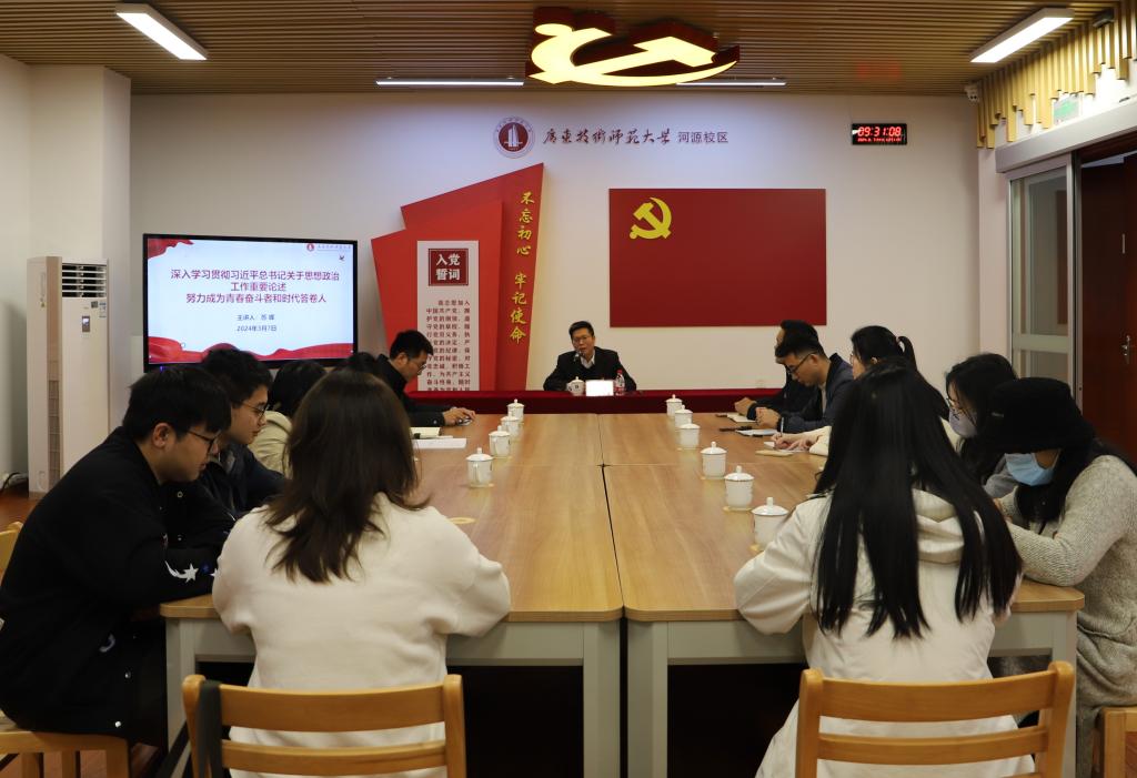 3月7日,学校副校长苏晖在河源校区党员活动中心为党员师生代表讲授题为《深入学习贯彻习近平总书记关于思想政治工作重要论述,努力成为青春奋斗者和时代答卷人》的专题党课。河源校区党委第一党支部全体党员及师生代表参加党课学习。