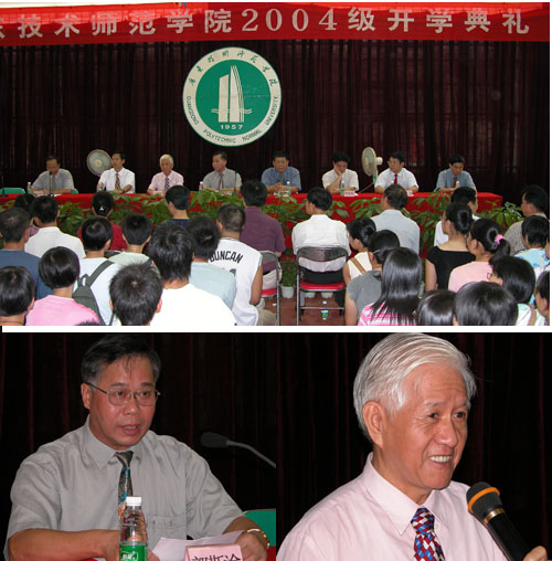 院长郭斯淦教授代表全院师生向加入我们学院这个大家庭的2800多名新成员表示热烈的欢迎,并简要介绍我院的基本情况。他说,学院成立于1957年,原名广东民族学院。1998年改名为广东职业技术师范学院,2002年经广东省政府报国家教育部批准改为现名。学院从1977年开始招收本科生,迄今共授予23届毕业生学士学位,为国家培养了大批各类专业人才。目前在校共有各类学生25000人,其中校本部全日制在校生近万人,是广东十大万人高校之一。学院本部现有教职工703人,其中专任教师400人。专任教师中教授33人,博士、硕士共150人。学院拥有两个校区,下设10个教学系,3个教学部,7个研究机构,以及2个二级学院;现设置40个本科专业及其方向,覆盖文、理、工、管、教育、艺术等六大门类。