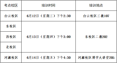 请各位监考员与相关考试工作人员依时参加培训(白云校区监考员尽量参加星期三白云校区培训),北校区监考员去白云校区参加培训时,在满足上课老师乘坐校车的前提下如有空座可乘坐,如无空座需自行安排前往。具体培训时间和地点如下: