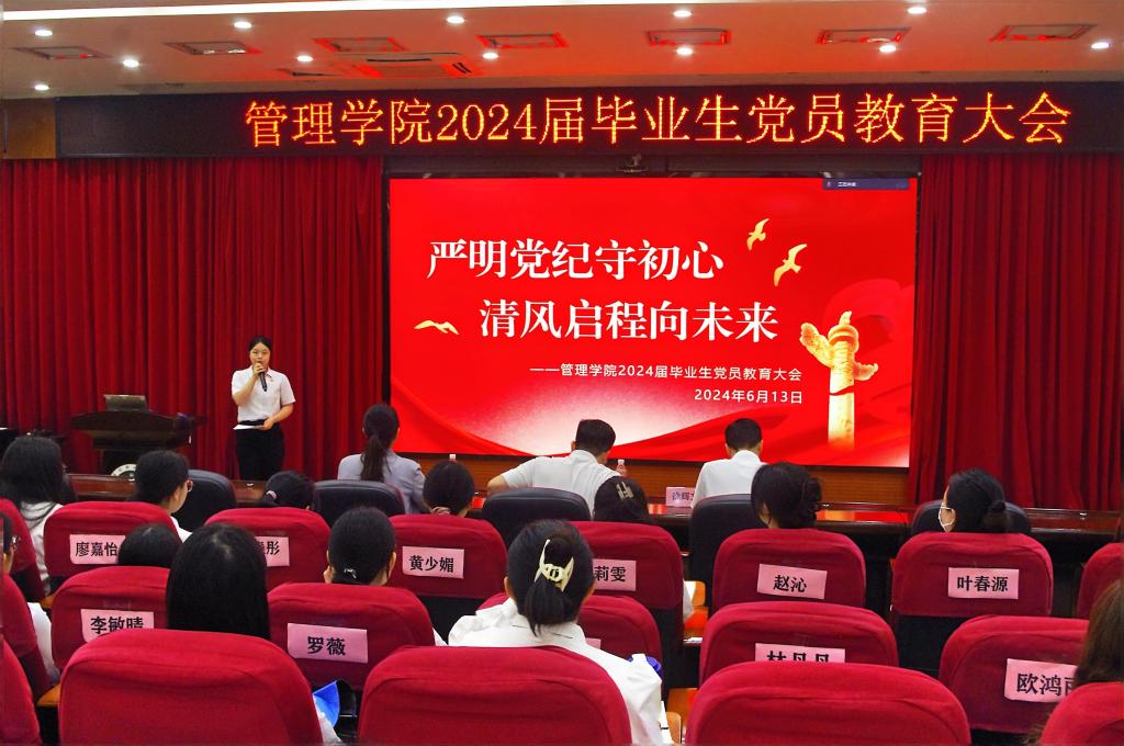 为深入学习习近平总书记关于党的纪律建设的重要论述,扎实开展党纪学习教育,进一步加强毕业生党员的党纪廉洁意识,引导毕业生党员牢记党的宗旨,走好廉洁人生路,6月13日上午,管理学院在白云校区三教104报告厅开展以“严明党纪守初心,清风启程向未来”为主题的2024届毕业生党员教育大会,管理学院党委书记陈军、党委副书记王婷婷、专职组织员徐辉文和全体2024届毕业生党员参加了会议。