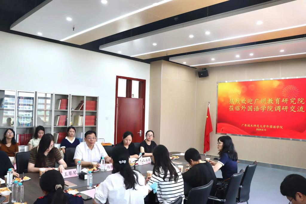 6月13日上午,广州市教育研究院教研员陈咏主任带领广州市中职学校22位英语专业教研组成员到浦京官网外国语学院调研交流。外国语学院党委书记杨伟光、党委副书记王琴琴、副院长王永建、陈倩等领导及相关人员一同参加调研交流。