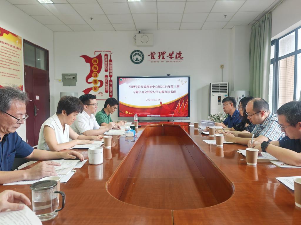 为深入学习贯彻习近平总书记关于全面加强党的纪律建设的重要论述,推进党纪学习教育走深走实,6月18日上午,管理学院召开党委理论学习中心组2024年第三期专题学习会暨党纪学习教育读书班。会议由学院党委书记陈军主持,学院领导班子成员、党委委员、教工党支部书记、党政办主任、专职组织员等参加了会议。